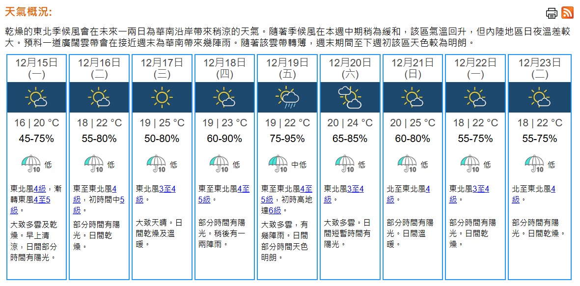 即時熱點 天氣|天文台:周一市區16°C-20°C 多雲乾燥 相對濕度料低至45% (19:08) 發佈於 2 個月 前 2025 年 12 月 14 日 By 明報 乾燥東北季候風正影響廣東沿岸。下午本港大部分地區的相對濕度維持在40%以下。此外,一道雲帶正覆蓋華南。本港地區明日(15日,周一)天氣預測:大致多雲及乾燥。明早清涼,市區最低氣溫約16°C,新界再低幾度。日間部分時間有陽光,最高氣溫約20°C。明日漸轉吹和緩至清勁東風。相對濕度料45%-75%。展望本周中期部分時間有陽光,氣溫回升,但內陸地區日夜溫差較大。接近周末大致多雲。(天文台) 相關文章:天文台天氣天氣速遞編輯推介 Up Next 短片:美斯印度球場惹騷亂 球迷怒掟座椅 (12:46) 不要錯過 短片:錦田鄉酬恩建醮巨型醮棚十年一度 市民冀竹棚不會消失 「仍存在時盡量欣賞」 (19:31) 繼續閱讀 贊助商 猜你喜歡 天氣|天文台:周日早上市區最低14℃ 部分地區寒冷 (17:55) 天氣|天文台:多雲有幾陣雨 今晚轉涼降至約17℃ (09:25) 【Emily】天文台「矚目天氣及氣候事件選舉」 投票有機會獲紀念品 天氣|天文台:周六多雲有雨 晚上轉涼氣溫17至21°C 下周日跌至最低14°C (21:22) 天氣|天文台:短暫時間有陽光 最高19°C (08:24) 天氣|天文台:周四多雲早晚有微雨 氣溫介乎17至20°C (20:57)