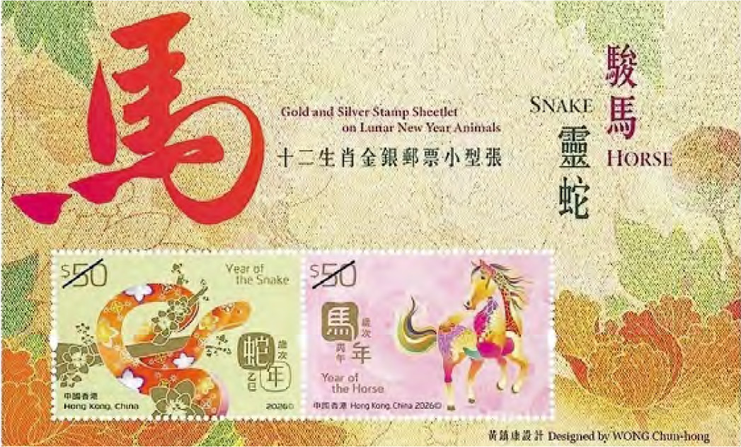 至於題為「靈蛇駿馬」嘅十二生肖金銀郵票小型張,嵌有「歲次乙巳(蛇年)」郵票及「歲次丙午(馬年)」郵票,面值各50元。郵票上嘅靈蛇同駿馬分別用銀箔及22K金箔燙壓點綴,仲附有黃金成色證明書。