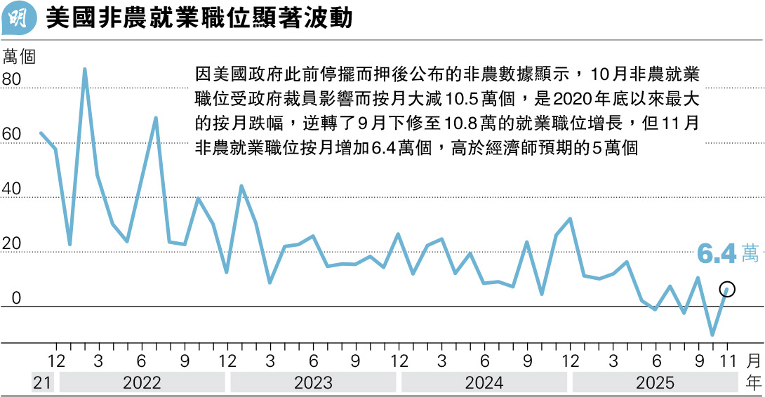 【明報專訊】受美國政府停擺影響而押後公布非農就業數據顯示,美國11月非農就業職位按月增長6.4萬個,高於經濟師預期的5萬個,惟10月就業職位按月減10.5萬個,是2020年底以來最大按月跌幅。主要由於政府裁員影響10月非農數據,大量聯邦政府僱員今年早前接受離職補償方案,當中很多人合約在10月完結,導致聯邦政府就業職位在10月大減16.2萬個,並在11月再減少6000個。由於政府停擺,包括10月失業率在內「當前人口調查」(CPS)家庭數據不會追溯收集,而11月失業率則升至4.6%,較9月高出0.2個百分點,是2021年9月以來最高。