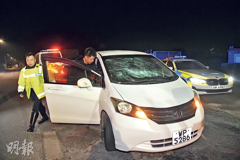 警方圍封現場調查,現場地上留下大灘血迹及一把長傘,肇事私家車車頭損毁,擋風玻璃爆裂呈「蜘蛛網」狀,32歲梁姓男司機被帶上警車接受調查。案件由新界北總區交通部特別調查隊跟進,任何人如目睹意外發生或有資料提供,請致電36613858聯絡調查人員。