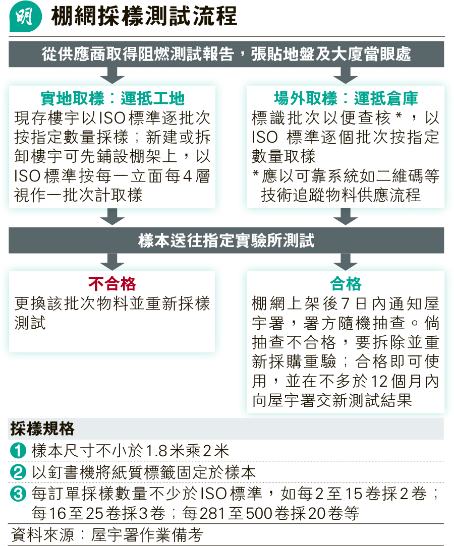 【明報專訊】大埔宏福苑火災揭發棚網未阻燃及檢測報告造假,屋宇署昨發表作業備考,規定承建商購入棚網後須檢測並錄像記錄,署方會抽查。作業備考列明,棚網運抵工地及貨倉後,承建商要採樣到政府指定實驗所測試,合格才可上架,上架7天內須通知屋宇署隨機抽查。有承建商管理層認為,採樣比例高料可杜絕混入假網。另外政府昨稱,建造業議會正籌備集體採購及統籌檢測服務,已選定香港建造學院新田訓練場為業界提供用地做場外取樣,爭取首批棚網在一個月內經採購及檢測後陸續上架。
