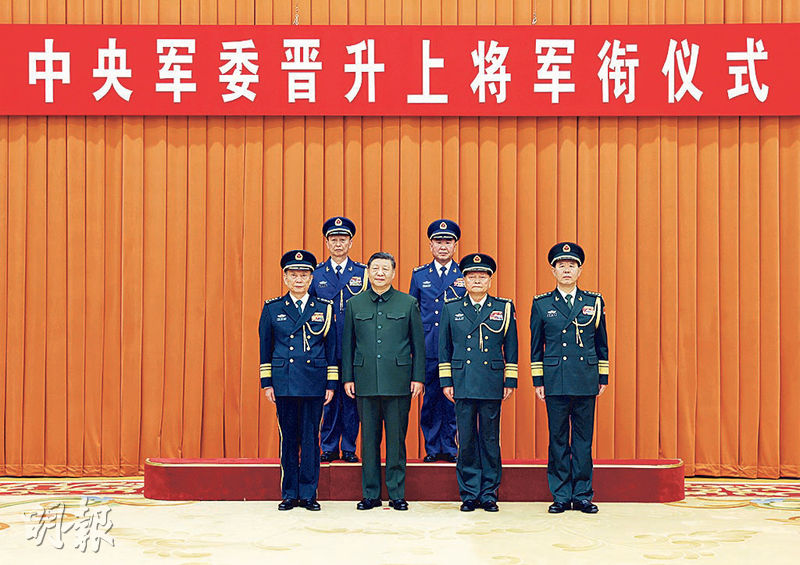 新華社報道,昨上午10時半許,晉銜儀式開始。中央軍委副主席張又俠宣讀習近平簽署的晉升上將軍銜命令。中央軍委副主席張升民主持晉銜儀式。