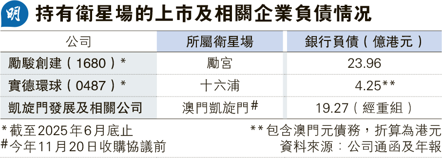 【明報專訊】多間有涉足衛星場的上市公司年報及澳博控股(0880)收購澳門凱旋門的通函顯示,勵駿(1680)及澳門凱旋門均負債經營,單是勵駿便背負23.96億元債務;凱旋門轉售予澳博前進行重組,已轉由澳博承擔未供完債務17.5億元,原賣方澳博聯席主席梁安琪甚至要向澳博提供部分持股作擔保,以尋求貸款約1.77億元處理銀行貸款尾數,故技術上與澳博交易,實際目的就是減債。