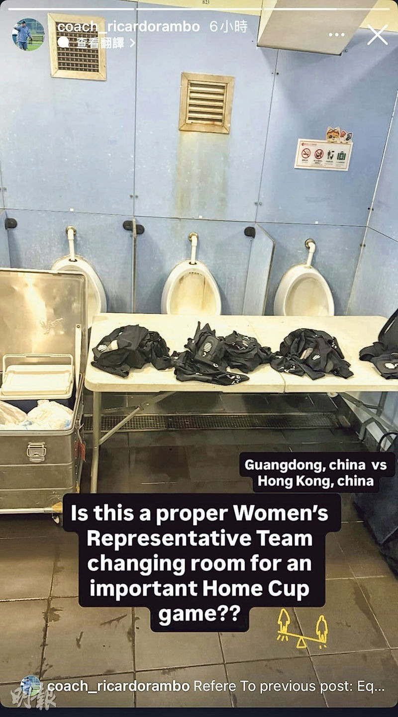 港隊女足主帥列卡度當日在社交平台上載限時動態,質疑在重要的主場賽事如此安排是否恰當;有當日上陣的足球員亦向本報說,更衣室當日狀况不理想,地板全濕,中場休息時要在更衣室外開會,但因附近嘈雜而受影響。張炎有今於商台節目《在晴朗的一天出發》表示,當日女足職員很早去佈置更衣室,當時無提出要求,足總人員見沒有反映或投訴,就去準備其他環節,下次會多加留意,如遮蓋尿兜。他亦表示,枱由運動場提供,並無限制放置的位置,而更衣室內有一門通往另一房間,該處亦可放置背心及飲品等。