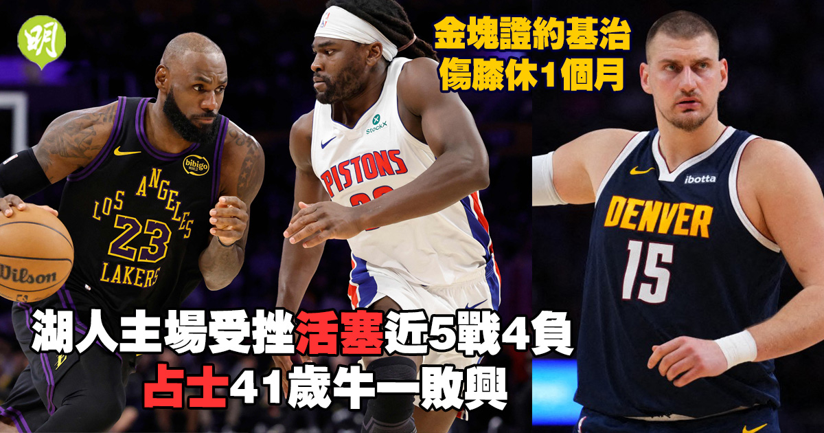 已征戰NBA賽場23季的「大帝」勒邦占士,昨(30日)於美國時間迎來41歲生日,但他為洛杉磯湖人主場出戰常規賽時僅攻下17分,球隊最終以106:128不敵東岸一哥底特律活塞,近5場比賽錄得第4場敗仗。至於丹佛金塊星級中鋒約基治日前面對邁阿密熱火時左膝受傷,今(31日)證實他料休戰一個月。