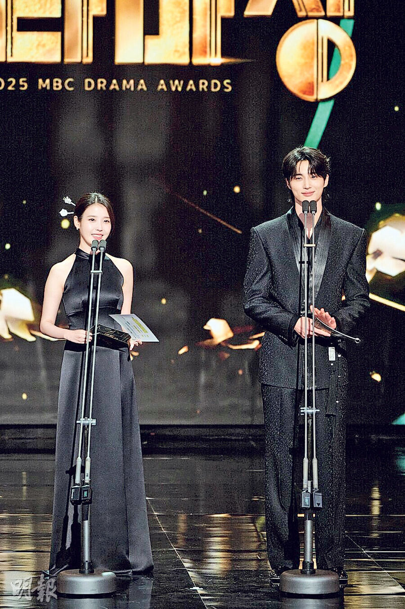 【明報專訊】韓國MBC電視台前晚舉行演技大獎頒獎禮,《臥底高中》成為大贏家,捧走劇集獎之外,男主角徐康俊拿下至高榮譽大獎,不過全晚焦點落在2026年上半年播出的《21世紀大君夫人》男女主角邊佑錫與IU身上,兩人除一起擔任頒獎嘉賓,又乘機為新劇宣傳,除了首條預告片曝光之外,兩人又表示希望2026年底的演技大獎,有望角逐年度劇集,「我們會盡全力讓它實現」。