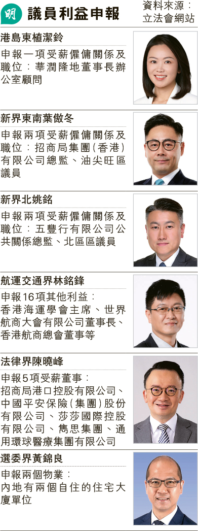 【明報專訊】新一屆立法會議員昨日上任,立法會網站亦陸續更新90名議員的個人利益登記冊,截至昨日最少34名議員的登記冊有更新,其中10名為新任議員。本報記者翻查並統計已上載的申報表內容,10名新任議員中有6人有申報其他受薪職務,當中葉傲冬、方國珊和姚銘均有申報區議員為「受薪職位」;本身是東區區議員的植潔鈴則申報為中資的華潤隆地董事長辦公室顧問。