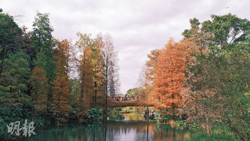 深圳四海公園是老牌公園,園內九孔橋、彎月廊、蓮花池周邊都是紅杉,蓮花池旁還有古亭,紅杉與古亭於水中相呼應。除了四海公園,寶安區的九圍濕地公園、羅湖區的仙湖植物園和洪湖公園皆是賞杉勝地。其中,洪湖公園因交通方便,是許多人拍攝落羽杉的首選,伏龍橋則是園內觀賞落羽杉遠景的好位置,可將一大片橙紅色風光盡收眼底。