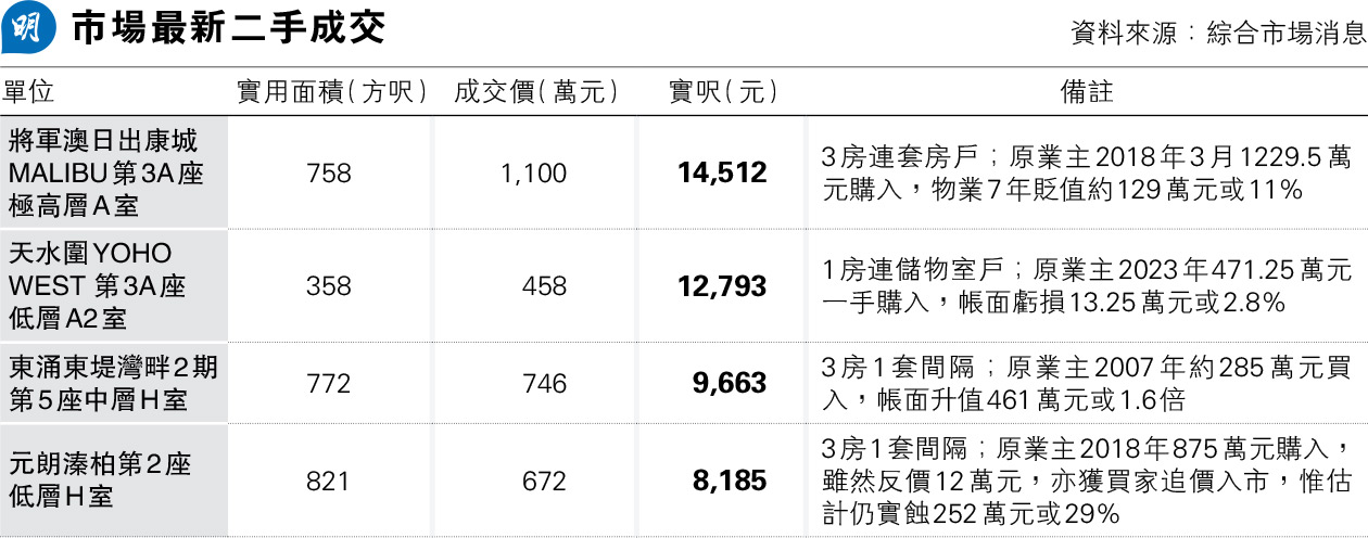 【明報專訊】二手物業市場依然不乏蝕讓成交,其中將軍澳日出康城MALIBU「開齋」,新錄新年首宗成交。香港置業首席分區董事劉浩勤表示,MALIBU第3A座極高層A室,實用758方呎3房1套房海景戶,原業主上月初以1200萬元放售,新近獲洽詢,議價後減100萬元或8%,以1100萬元易手、實呎14,512元;原業主2018年3月以1229.5萬元一手購入,持貨逾7年,帳面蝕約129.5萬元或11%,若連稅項及其他使費,估計實蝕約187萬元或15%。