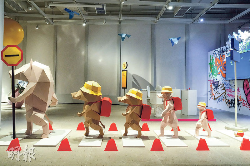 香港雙人創作組合Stickyline的梁子程和黎意雄,則以作品提問:「城市野生動物是否只有遵守人類規則,才能生存下去?」梁子程指,他們留意到人類不斷擴張城市邊界,侵佔動物的棲息地,卻反過來要求動物適應人類的交通規則、衛生標準。他們以擅長的紙本藝術雕塑,構建出可愛卻荒誕的作品《城市動物寓言》,嘗試引發觀眾思考。展場中野豬不再是橫衝直撞的猛獸,而是像幼稚園學生一樣,在指引下井然有序地過馬路;一群中華白海豚戴上防毒面具艱難生存,幾隻白鴿亦老老實實坐在馬桶上如廁。