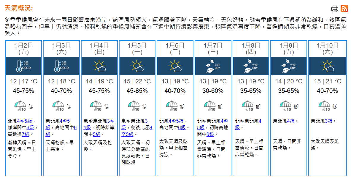 即時熱點 天文台發入冬以來首個寒冷天氣警告 周五市區最低12°C (16:32) 發佈於 1 天 前 2026 年 1 月 1 日 By 明報 香港天文台在今午(1月1日)4時20分發出今年首個寒冷天氣警告,亦是入冬以來首次,預測本港未來一兩日早上天氣寒冷,明日(2日)市區最低氣溫約在12°C,新界會再低兩三度。 天文台表示,一道冷鋒正橫過廣東沿岸地區,與其相關的冬季季候風正逐漸影響該區。本港地區今晚及明日大致多雲,明日漸轉天晴。早上寒冷,日間乾燥,最高氣溫約17°C。吹和緩至清勁偏北風,離岸及高地間中吹強風。展望周六(3日)早上仍然寒冷,日夜溫差較大。下周初持續天晴乾燥,但早上天氣清涼。(天文台) 相關文章:天文台天氣寒冷天氣警告熱門HOTPICK編輯推介 Up Next 短片:全球各地迎2026年 (11:41) 不要錯過 人口普查1月1日起全年進行 如何知道被選中?如何提交資料?|2026人口普查Q&A (14:37) 繼續閱讀 贊助商 猜你喜歡 【Emily】昨寒冷警告歷來最遲首發 今早市區12℃ 天氣|天文台:大致多雲 最高22°C (09:10) 人口普查1月1日起全年進行 如何知道被選中?如何提交資料?|2026人口普查Q&A (14:37) 人口普查1月1日起全年進行 如何知道被選中?如何提交資料?|2026人口普查Q&A (14:37) 短片:全球各地迎2026年 (11:41) 2026年加價.長者篇|2026年長者2元乘車優惠將改推「兩蚊兩折」 公院睇專科普通科診金上調 (11:16)