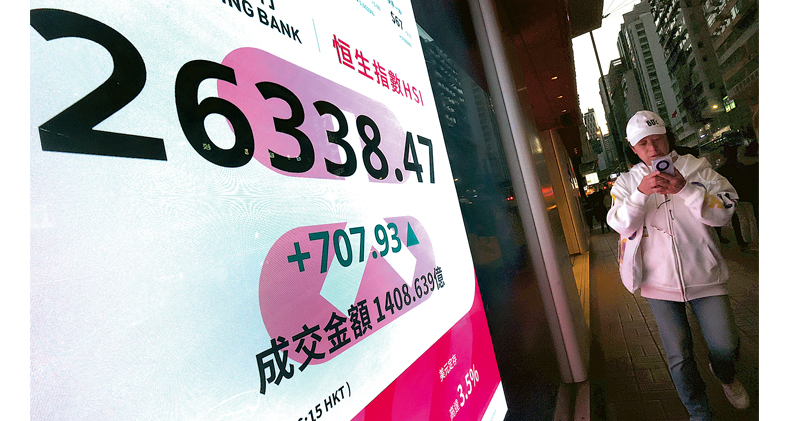 【明報專訊】港股踏入2026年首個交易日「開門紅」,在韓台區內股市同創新高氛圍配合下,重磅科技股再成領漲大市火車頭,加上藍籌金融股全線向上,推動恒指連續升穿多條技術線。恒指收升逾700點或2.76%,創逾7個月最大升幅,更為13年以來最強(以升幅計)新年開局表現(見表),且跑贏區內股市。不過,本報統計顯示,恒指在2018、2020及2021年首日收市報升後,當年全年累計均錄跌幅,當中以2018年累跌15.3%「最傷」。有證券界人士指出,資金流入過夜,預計下周港股有機會繼續向上。