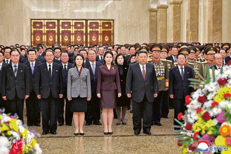 朝中社周五(2日)的報道沒有具體提及哪人隨金正恩同行,但從官方集體謁陵照片,可見現場除了有他的妻子李雪主及多名黨政軍高層官員以外,金主愛也首次出席此活動,且在太陽宮大廳中站在第一排父母之間的中央位置,儼如主角,後面則是一衆官員和軍方高層。