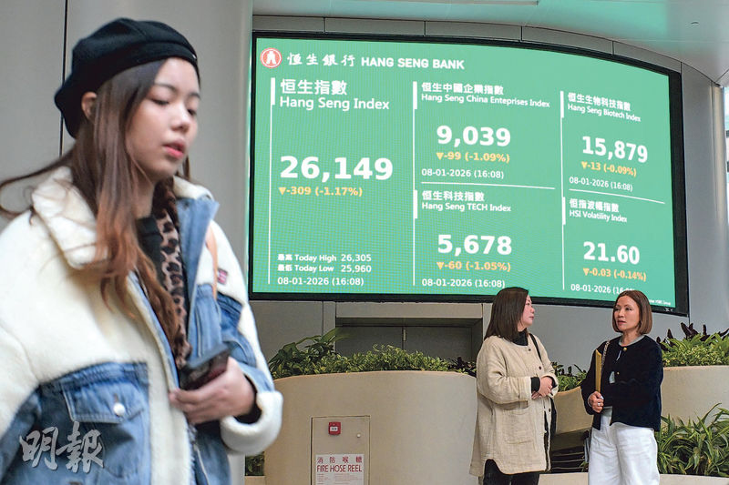 【明報專訊】港股跌勢未止,恒指昨與日股外圍同步回落,曾挫近500點失守二萬六關,收市跌309點,兩天累跌561點,2026年開局逾千點的升幅回吐逾一半。重磅科技股、藍籌金融股全線下跌,科指最多曾跌2.2%,北水全日走資49億元,為近一個月最多。A股抗跌力相對強韌,上證綜指微跌不足0.1%,A股兩融金額更再創新高。證券界指出,缺乏好消息下大市短期難破高位,二萬六關支持亦不穩固。