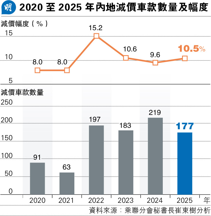 根據崔東樹分析,去年內地車市降價車型數目有所減少。燃油車降價車型按年減26款至52款,純電動車減5款至73款。雖然降價車型數量下降,降價幅度仍顯著。去年燃油車降價車型新車平均價約17.8萬元(人民幣,下同),平均降價幅度8.9%;新能源車降價車型平均價19.5萬元,平均降價幅度11%,高於燃油車。