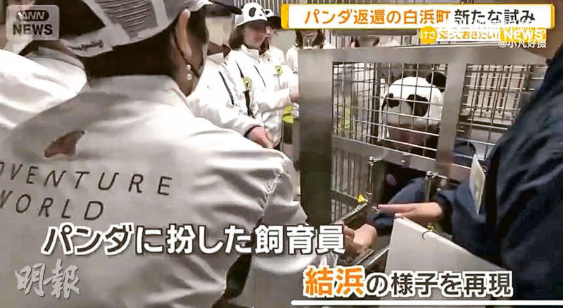 【明報專訊】日本最後兩隻大熊貓「曉曉」和「蕾蕾」本月底返回中國,日本即將進入「後熊貓時代」,日本民眾感到不捨,各動物園去年以來也紛紛發揮想像力攬客。日本和歌山白濱町野生動物主題公園「冒險世界」推出「大熊貓飼養員深度體驗一日遊」,讓熊貓粉絲身著同款制服體驗熊貓飼養員的工作,包括餵食、抽血等,更有動物園職員打扮成熊貓蹲在鐵籠中與遊客互動(圖)。該活動收費每人8000日圓(約395港元),每周末開放。