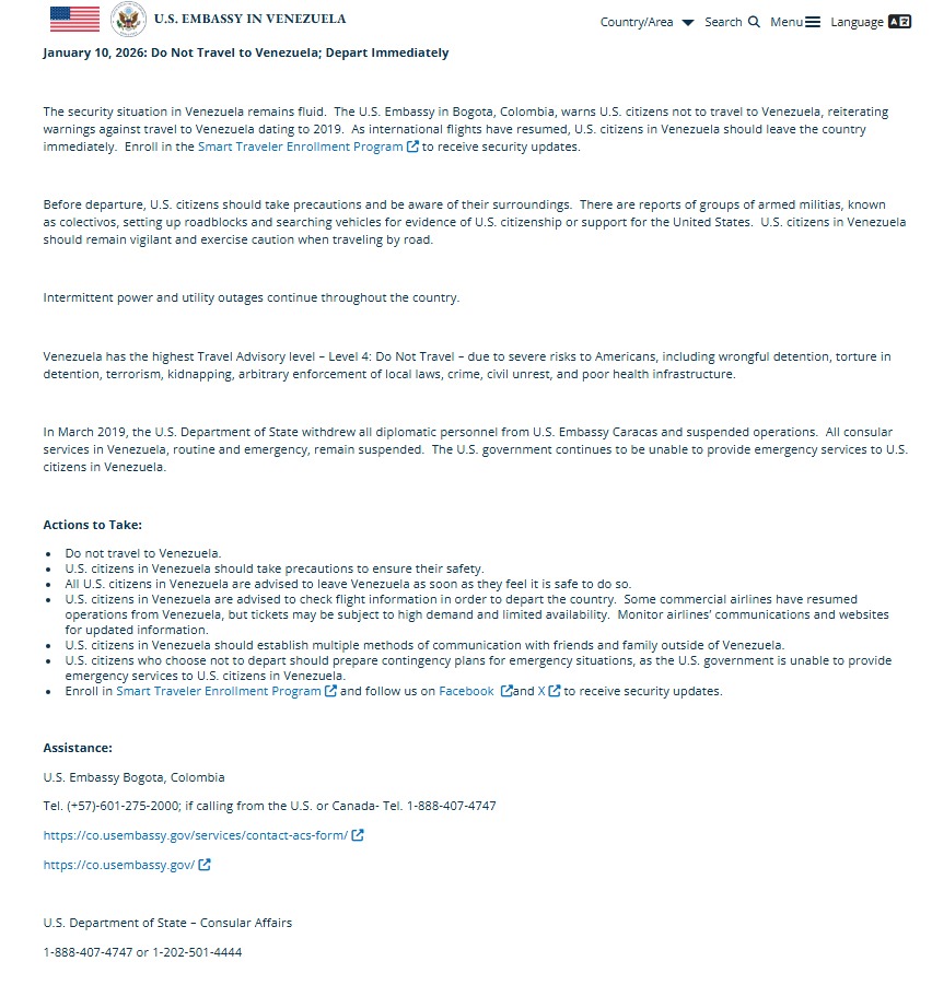 即時國際 美國呼籲國民立即離開委內瑞拉 (10:42) 發佈於 2 個月 前 2026 年 1 月 11 日 By 明報 美國駐委內瑞拉大使館上周六(10日)發聲明呼籲,隨着國際航班恢復,身處委內瑞拉的美國公民應立即離開委內瑞拉。 美國駐委內瑞拉大使館表示,委內瑞拉局勢瞬息萬變,美國繼續維持對委內瑞拉的旅遊警示──第四級「勿前往」,並重申自2019年以來已多次發出旅遊警示。報告指出,委內瑞拉有民兵武裝組織設置路障和搜查車輛,以尋找美國公民或支持美國的證據。美國公民在委內瑞拉倘經陸路出行,必須提高警惕並謹慎行事。(美國駐委內瑞拉大使館/新華社) 相關文章:委內瑞拉旅遊警示編輯推介美國美國委內瑞拉美國駐委內瑞拉大使館 Up Next 韓檢方要求判處前總統尹錫悅死刑 (21:02) 不要錯過 緬甸大選第二階段投票已開始 (11:33) 繼續閱讀 贊助商 猜你喜歡 華盛頓首辦關鍵礦物會議 擬建戰略聯盟 特稱與古巴領導層談判 有望達協議 未遮部分姓名裸體 司法部被轟二次傷害 特嫌「太覺醒」 文化殿堂大翻新 美伊釋談判信號 未棄動武選項 哈梅內伊警告開戰將波及整地區 美抵制加劇財困 聯國恐7月「無錢用」 難解結構性財務風險 古特雷斯促成員國交會費