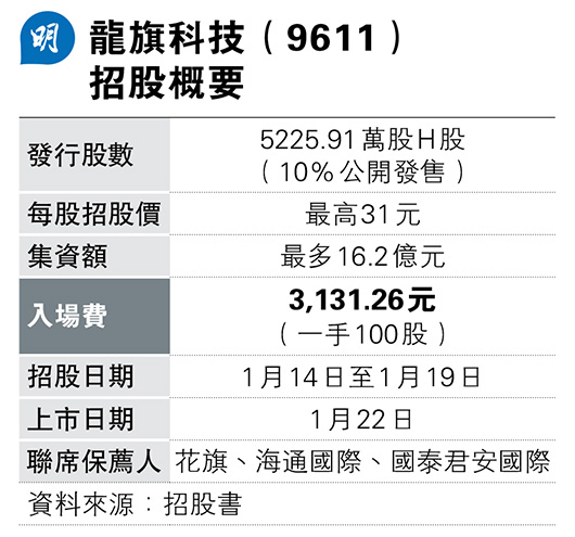 【明報專訊】消費電子原設計生產商(ODM)、在A股上市的龍旗科技(9611)昨日起至下周一(19日)招股,採取不設回撥的機制B發行,全球發售5225.91萬股H股,10%於香港公開發售。每股招股價不高於31元,集資最多16.2億元。一手100股,入場費3131.26元,預期1月22日掛牌,花旗、海通國際及國泰君安國際為聯席保薦人(見表)。