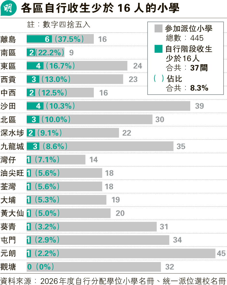 「2026年度統一派位各小一學校網選校名冊」昨日出爐,臚列各校暫定統一派位學額。小一派位機制分兩輪,分別是去年9月完成的自行分配學位,以及下周開始的統一派位,本報按兩輪學額,推算全港445間官津小學在自行階段的收生情况,發現約37間(8%)收生未夠16人、即未達「開班線」,其中官小佔約6間,包括筲箕灣官立小學,取錄約2人。按區劃分,離島區約6間小學收生未達16人,是各區之最(見圖)。學校收生若連同統一派位階段仍未滿16人,將逼近「殺校」邊緣,或要申請「救校」方案。