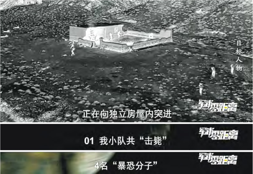 央視披露反恐演習畫面顯示,在精準轟炸後,特戰小分隊突擊組迅速進入一棟獨立房屋,不到2分鐘,「擊斃4名暴恐分子」。