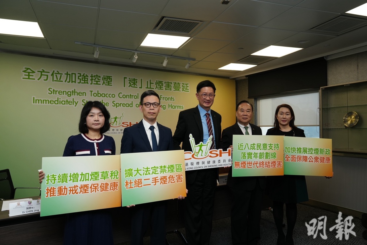 本港目前的煙草稅約為63%,未達世界衛生組織的建議的75%,委員會建議在2026/27財政年度,增加煙草稅至75%的水平,並在之後按年增加。委員會亦倡議,在2027年前落實所有短期控煙措施,包括禁止加味煙,禁止另類煙機等;促使政府儘快實施中、長期控煙措施,包括「無煙世代」政策及訂立清晰時間表等。