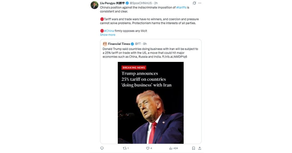 中國駐美國大使館發言人在社交平台X發文表示,中國反對隨意加徵關稅的立場一貫且明確。關稅戰和貿易戰沒有贏家,脅迫和壓力也解決不了問題。該發言人續稱,「中國堅決反對任何非法單邊制裁和長臂管轄,並將採取一切必要措施維護自身合法權益」。