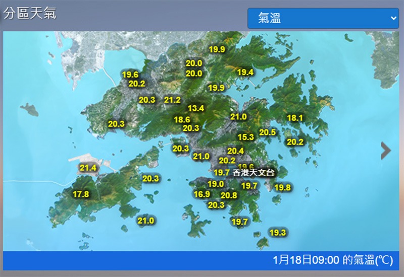 乾燥東北季候風正為廣東帶來普遍晴朗天氣。早上9時,天文台錄得氣溫19.7°C,相對濕度48%。本港地區今日(18日)天氣預測:天晴,日間非常乾燥,市區最高氣溫約23°C。吹和緩至清勁東至東北風,初時離岸及高地間中吹強風。展望明日(19日)持續天晴,日間溫暖。周二風勢增強,晚上氣溫顯著下降,隨後兩三日逐步轉冷,最低氣溫在12°C左右。