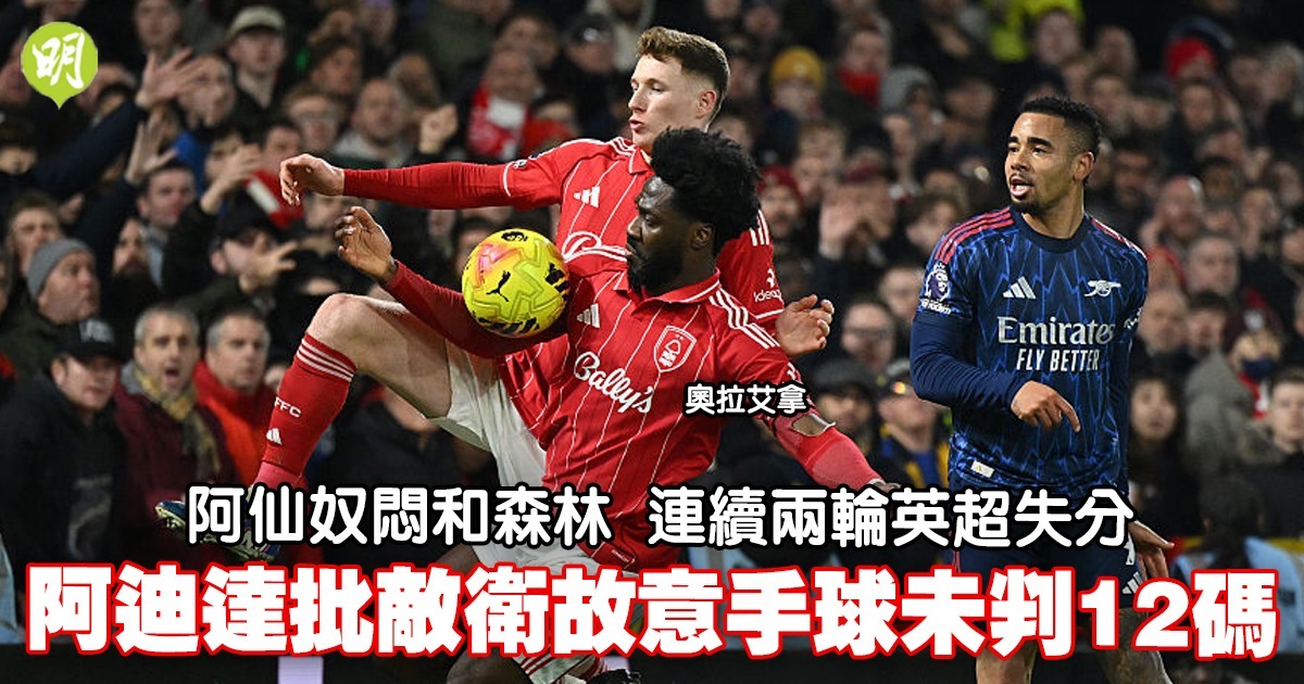 英超︱阿仙奴悶和森林連續兩輪失分 阿迪達批敵衛故意手球未判12碼 (17:45)