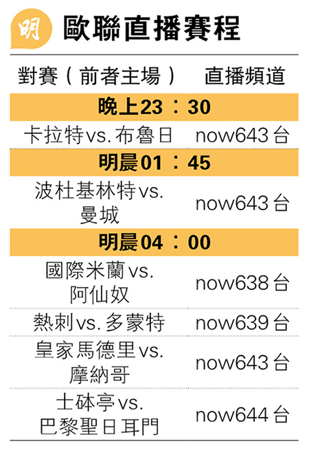 此外,第11位的熱刺將主場撼第10位的多蒙特。熱刺日前英超主場1:2負韋斯咸後,法蘭克再傳帥位不保。英媒確認這名丹麥籍教頭仍會出席賽前記者會,此戰料成其去留關鍵戰。