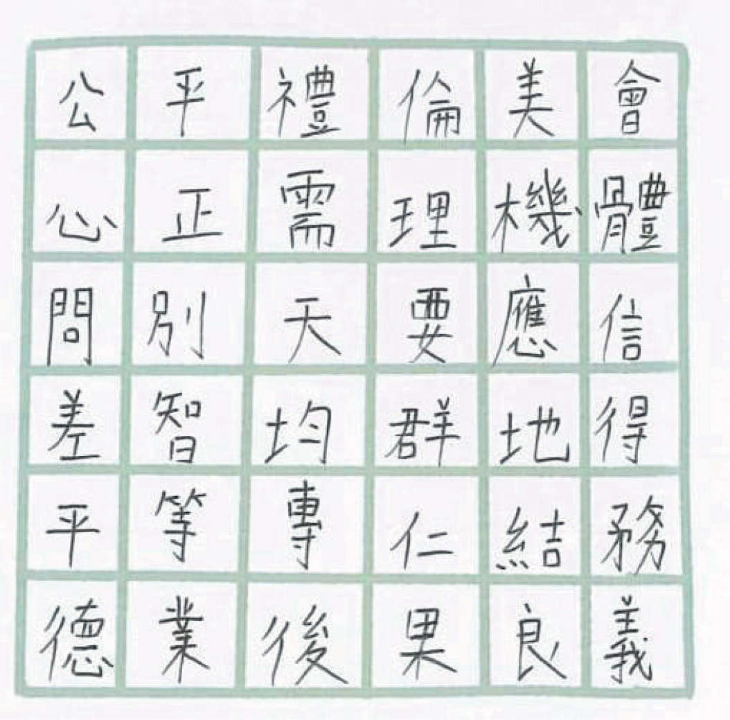 (字謎答案:公平、公正、平等、均等、機會、結果、需要、應得、差別、義務、後果、專業、倫理)