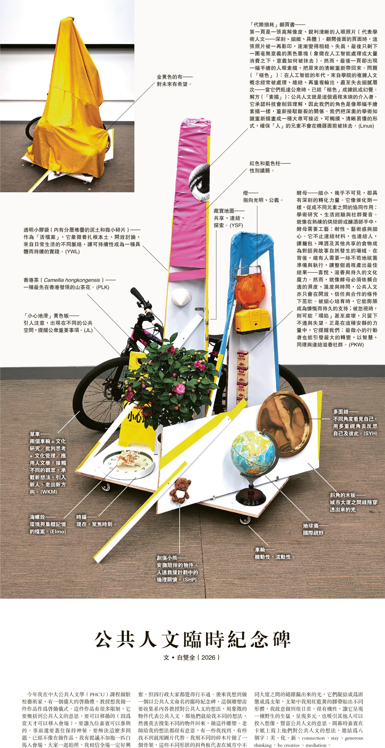 【明報專訊】今年我在中大公共人文學(PHCU)課程做駐校藝術家,有一個盛大的啟動禮,教授想我做一件作品作為啟動儀式。這件作品有很多限制,它要概括到公共人文的意思,要可以移動的(因為當天才可以移入會場),要讓九位嘉賓可以參與的,事前還要蓋住保持神秘。要解決這麼多問題,已經不像在做作品,我有提議不如拖一匹白馬入會場,大家一起拍照,我相信全場一定好興奮,但因行政大家都覺得行不通。後來我想到做一個以公共人文命名的臨時紀念碑,這個雕塑需要收集系內各教授對公共人文的想法,用象徵的物件代表公共人文,那他們就給我不同的想法,然後我去搜集不同的物件回來,做這件雕塑。老師給我的想法都很有意思,有一些我找到,有些找不到就用圖片代替。我用不同的碎木片做了一個骨架,這些不同形狀的斜角板代表在城市中不同大廈之間的縫隙漏出來的光,它們凝結成為固態成為支架,支架中我用紅藍黃的膠帶貼出不同形體,我故意做到很日常,很有機性,讓它呈現一種野生的生猛,呈現多元,也吸引其他人可以投入想像,豐富公共人文的意思。開幕時嘉賓在卡紙上寫上他們對公共人文的想法,總結為八個字:美、化、新、connection、stay、generous thinking、be creative、mediation。