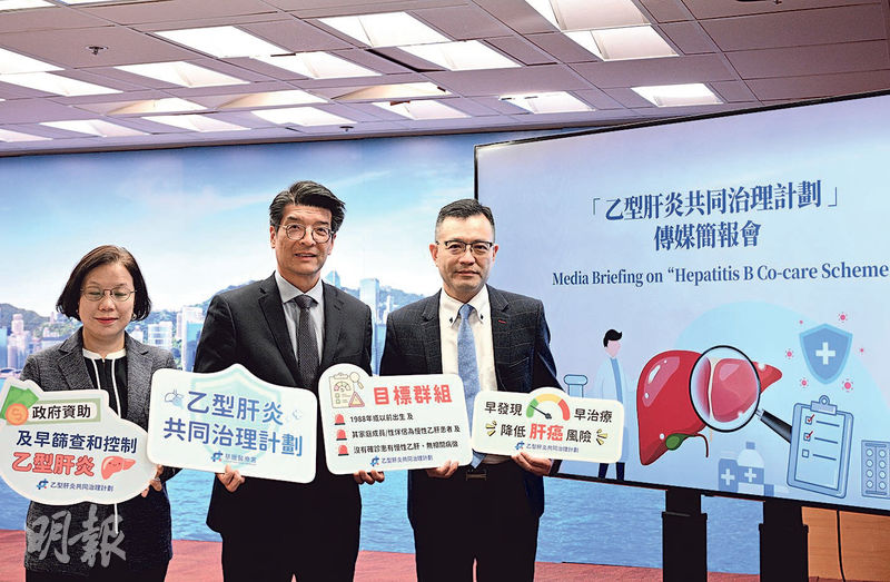 【明報專訊】基層醫療署下月7日推出「乙型肝炎共同治理計劃」,資助高風險群組到私營家庭醫生接受慢性乙肝篩查和治療。參加者在篩查階段須付180元,若確診,每年可獲最多4次資助診症跟進,政府建議每次診症共付額為150元。基層醫療健康專員彭飛舟說,合資格市民由於未接種乙肝疫苗、家人或性伴侶有慢性乙肝等,其風險最高,推出計劃是盼精準保護他們,預計30萬合資格對象中,7.8%會篩查出患病。
