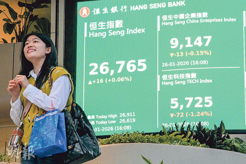 信誠證券聯席董事張智威認為,內地表態希望股市降溫,外圍局勢不明朗,都限制港股走勢,但又未有重大負面因素,預計短期恒指在26,200至27,000點區間波動。由於格陵蘭爭議後,部分歐洲機構準備減持美元資產,下任聯儲局主席或傾向減息,都使市場進一步看淡美元,轉投有實貨的貴金屬等避險,相信金、銀、銅等資源股前景續樂觀。