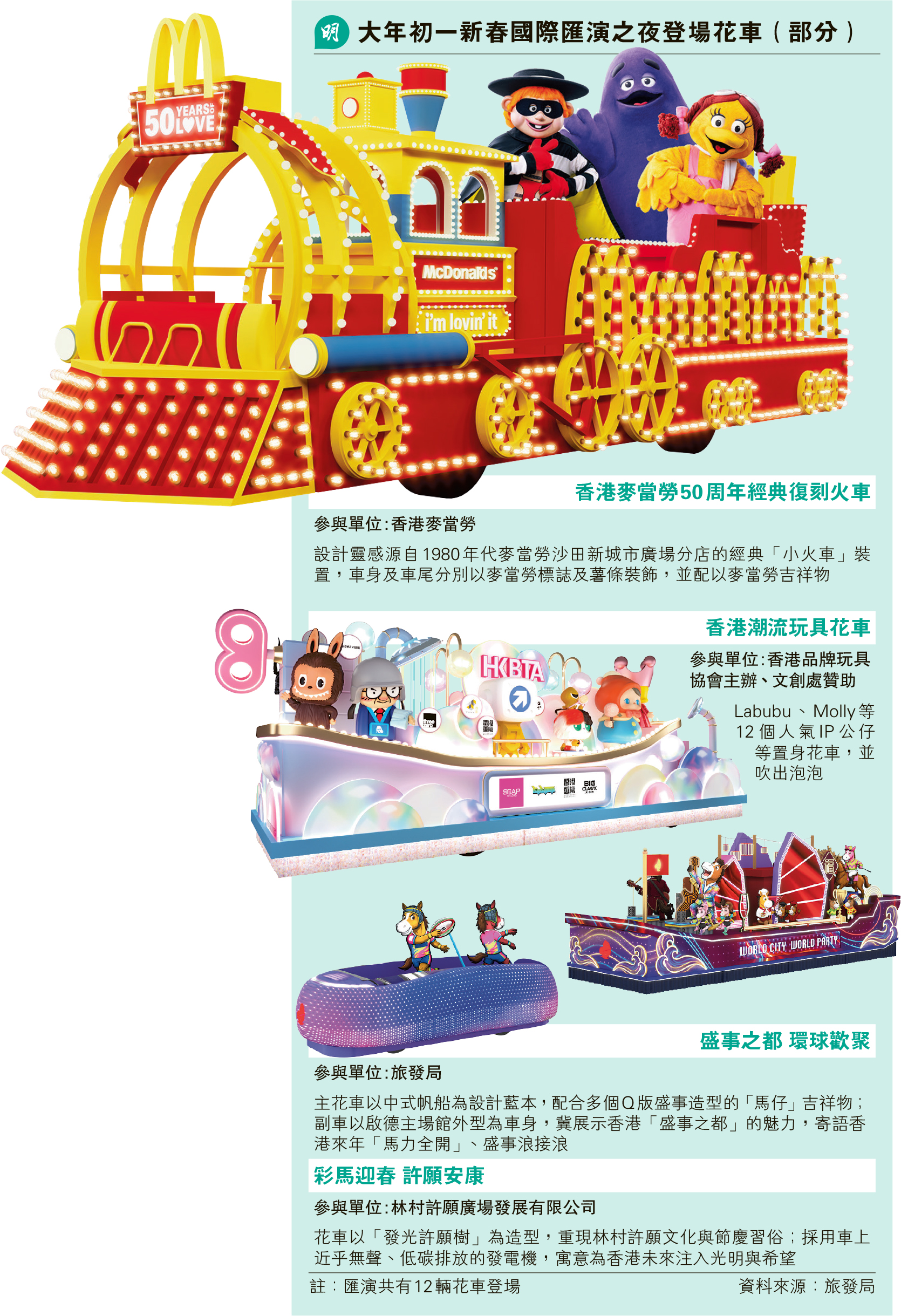 【明報專訊】馬年將至,旅發局將於農曆大年初一(2月17日)舉行「國泰新春國際匯演之夜」,合共有58隊花車及表演隊伍參與,分別來自本港、內地、意大利等逾10個國家或地區,其中首年參與的麥當勞花車以1980年代沙田新城市廣場分店的經典小火車裝置為設計靈感;旅發局則以「雙花車」形式展示,其中副車設計成啟德主場館,展示香港「盛事之都」魅力。旅發局預計年初一當日有10萬人參與,旅客及港人各佔一半。