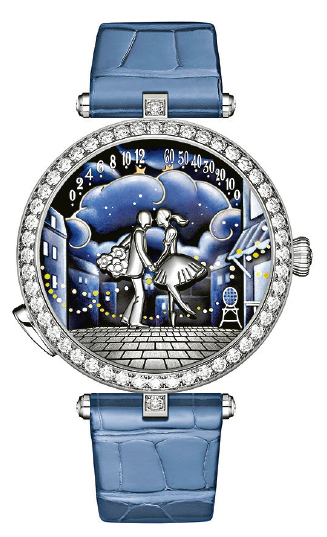 Lady Arpels Bal des Amoureux Automate腕表的場景源自19世紀巴黎周邊地區的戶外舞蹈咖啡廳,一對戀人緩緩靠近指示時分。
