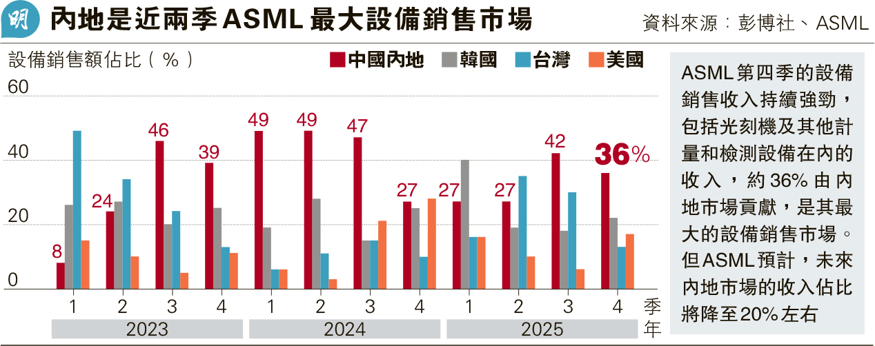 ASML表示,隨着晶片商擴大產能,其最先進的EUV光刻機收入將在今年「顯著增長」。由於出口限制,ASML無法向中國內地市場出口最先進的設備。ASML預計2026年中國市場收入將佔其設備銷售額的兩成,由第四季的36%(見圖)大幅下滑。