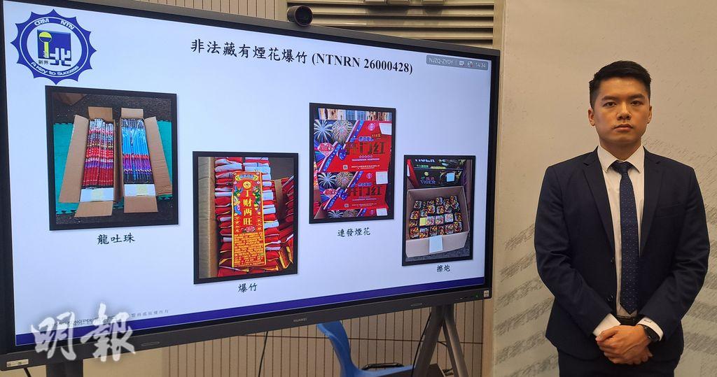 新界北總區反三合會行動組昨日(26日)下午約4時,在屯門大欖涌拘捕一名37歲男子,並於其租用貨櫃箱內檢獲58箱煙花炮仗,包括「龍吐珠」、擦炮及炮仗等,重約800公斤,市值約100萬元。新界北總區反三合會行動組高級督察郭文煒表示,鑑於農曆新年前常有非法煙花交易活動,警方透過情報主導,打擊煙花爆竹相關罪行,相信已成功阻止煙花流入市場。