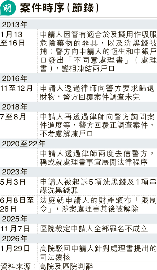 法官高浩文在判辭歸納涉案時序及申請方理據指出,2013年1月,申請人因涉管有適合於及擬用作吸服危險藥物的器具,以及洗黑錢被捕,同月警方向其名下恆生及中銀戶口發處理書。自2016年11月,申請人多次透過律師查詢案件進度等,警方曾回應案件調查未完,暫不打算解凍涉案銀行戶口(見表)。