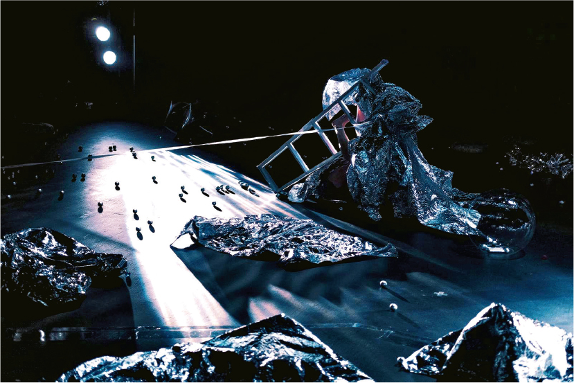 空間設計師陳默戴着頭燈入場。忽而覺得,她才是那架遙控小車,探照、觸發空間。至此,銀才算真正活過來了。我說活,不止是隱喻,地面的銀色布幔開始鼓動,開合。蚌殼、捕蠅草,或無舌的嘴,諸如此類的聯想。我忍不住探看機關在何處,但光與影說,要有耐心。而陳默已悄然坐下,於一角搭建銀色建築。音樂逐漸轟鳴。