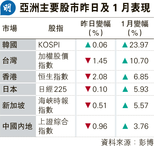 【明報專訊】港股七連升,累漲近千五點後「斷纜」。受美元反彈影響,金銀等貴金屬高位閃崩近9%,引發資金風險胃納明顯下降,大市昨跟隨外圍回落,恒指全日跌2%,但恒指1月仍累升6.85%,為2023年以來最強勁的1月,表現勝過累升逾5%的日本及新加坡股市,惟跑輸韓台股市。