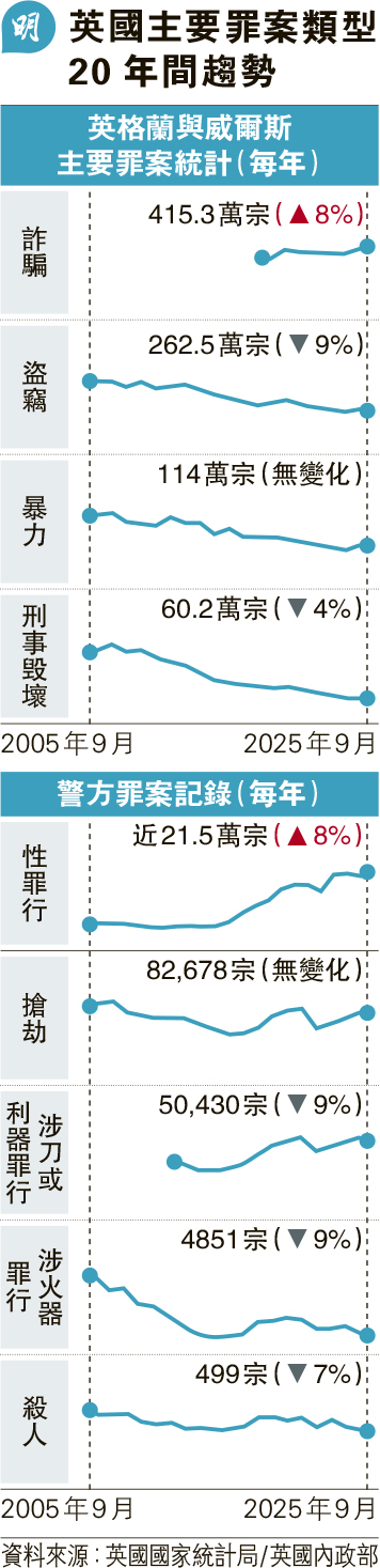 【明報專訊】英國統計局(ONS)周四(29日)公布英格蘭和威爾斯罪案最新數據,顯示槍擊案等嚴重罪案近十年普遍持續減少,殺人案尤其錄得近半世紀新低。惟詐騙案卻有增加,上升至佔總數近45%,性罪行也升至新高。