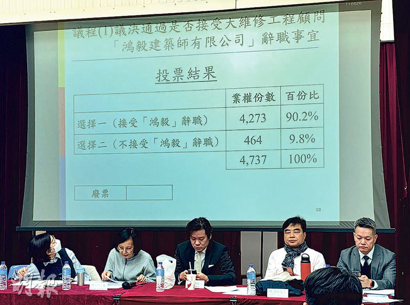 另外,近42年樓齡的大埔八號花園法團昨午召開特別業主大會,約300戶業主出席,並以95.92%及97.8%業權份數,分別贊成撤銷屋苑大維修工程及終止聘用顧問「卓越展圖建築師有限公司」。