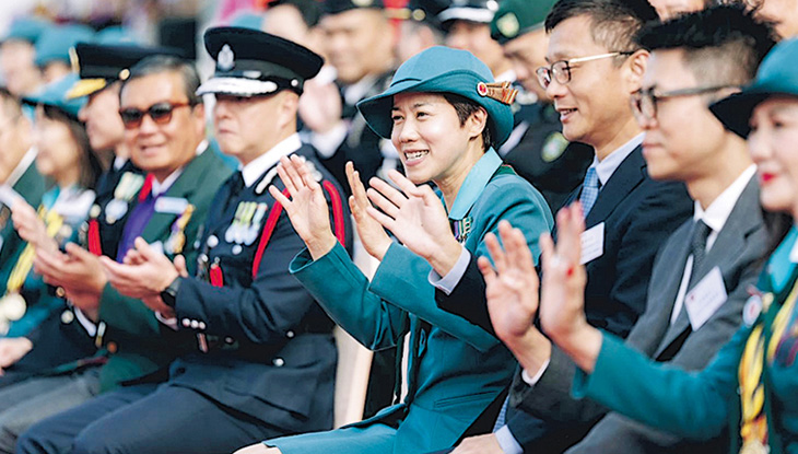 【明報專訊】香港女童軍110周年大會操噚日喺旺角大球場舉行,話呢項活動畀隊員聚首一堂,承傳女童軍傳統。政制及內地事務局前局長曾國衞早前以前列腺癌指數上升為由辭去官職,佢太太即海關前關長何珮珊,噚日以女童軍總會香港總監身分出席大會操,何珮珊被記者追問有關曾國衞嘅健康狀况時,未有回應提問就離開。