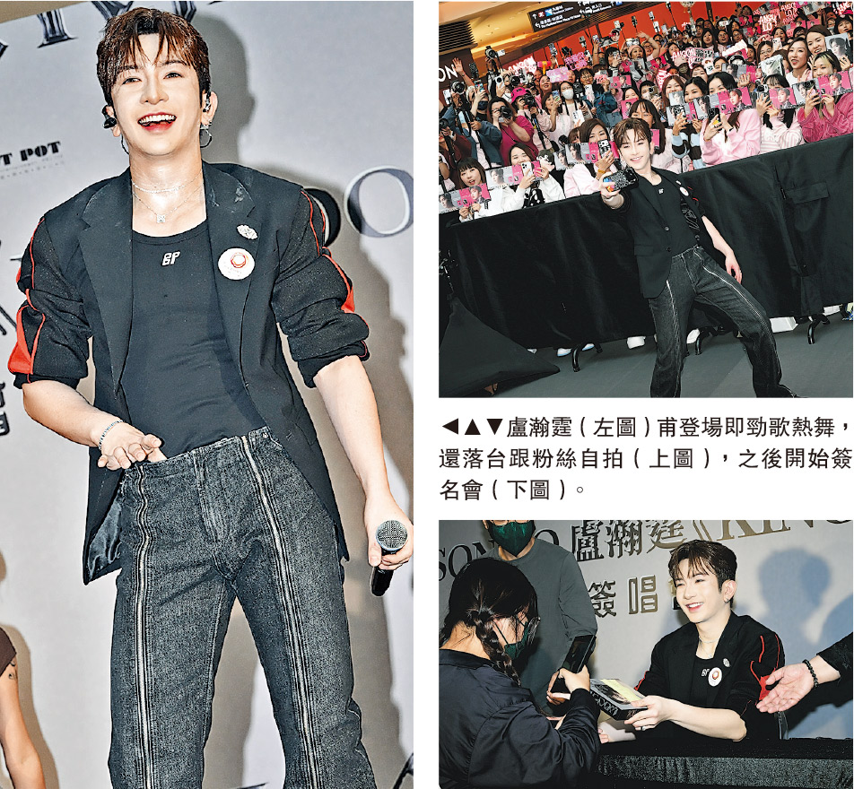 【明報專訊】盧瀚霆昨日在商場舉行首張個人專輯《KINGDOM》簽唱會,吸引大批粉絲迫爆現場,他除勁歌熱舞,還抽出幾名粉絲上台玩遊戲和自拍。盧瀚霆感激「神徒」(粉絲暱稱)以行動陪伴他成長,預告將推兩首新歌,年中拍新劇。他表示舉行人生首個簽唱會,意義重大,不過因場地有限制,簽名額只得400個,知道很多神徒很辛苦爭取機會,再開簽唱會機會不大,只能盡快做第二張專輯。