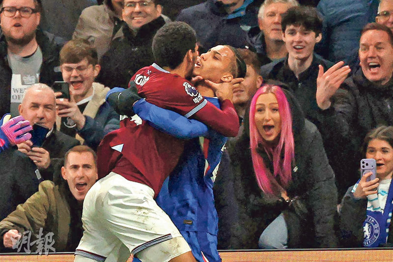 【明報專訊】英超昨屢演入球騷,當中車路士在主場半場落後兩球下,藉主帥羅辛尼亞易邊後調動奏效連轟3球以3:2反勝韋斯咸,比賽末段兩軍球員爆發大規模肢體衝突,惟球證安東尼泰萊最終僅向「鎚仔幫」後衛圖迪保拔紅。