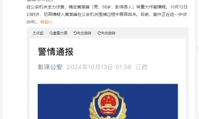 江西省彭澤縣公安局10月13日通報,彭澤縣龍城鎮一個...