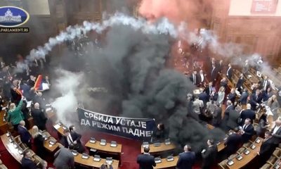 塞爾維亞反對派議員周二(4日)在國會內投擲照明彈、煙...