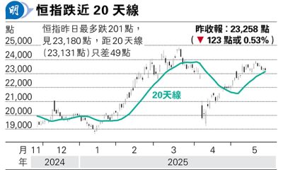 【明報專訊】恒指昨跌123點,收報23,258點,成...