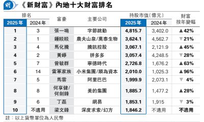 【明報專訊】內地《新財富》雜誌發布2025年「500...