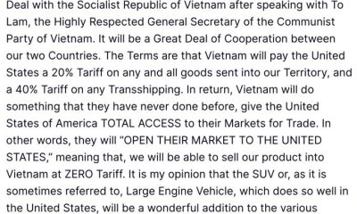 美國總統特朗普周三表示,已經與越南達成貿易協議,將對...